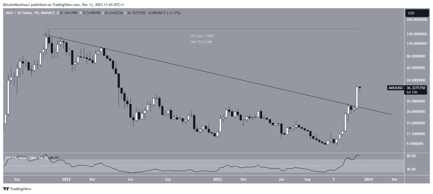 Berdasarkan analisis teknikal pada time frame mingguan, terlihat bahwa harga AVAX telah meningkat dengan pesat sejak Oktober. Kenaikan ini berujung pada tercapainya puncak tahunan baru di angka US$38 pada hari Minggu.