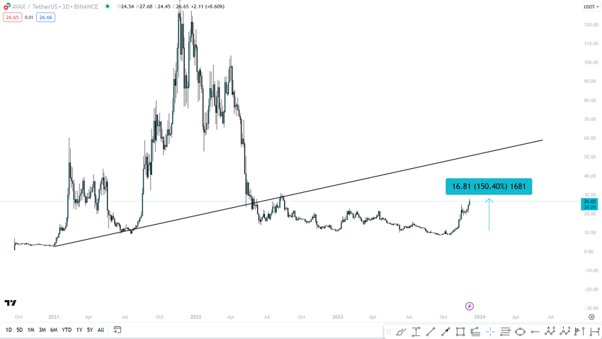 Dalam proses kenaikan ini, AVAX berhasil menembus garis tren descending resistance 750 hari, yang sebelumnya sudah ada sejak harga mencapai rekor ATH.