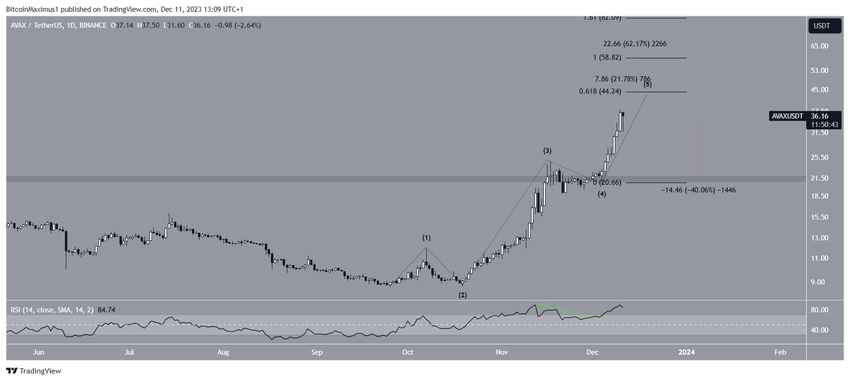 Berdasarkan time frame harian, skenario yang mungkin terjadi menunjukkan bahwa harga AVAX saat ini berada dalam fase kelima dan terakhir dari pergerakan naiknya yang dimulai pada Oktober.