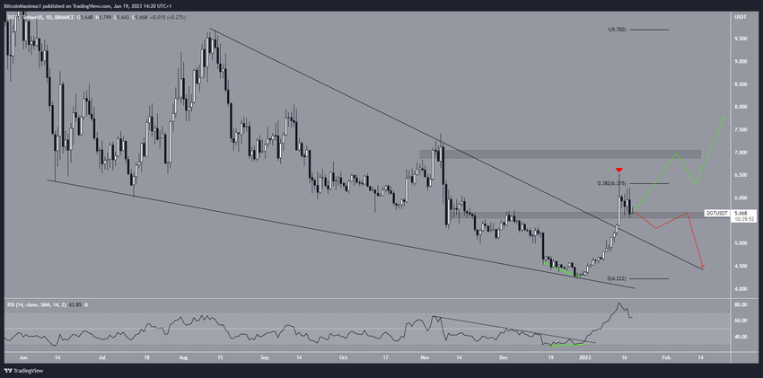 SponsoredMeski begitu, harga Polkadot sendiri telah memulai tahun 2023 dengan sebuah aksi kenaikan yang menyebabkan harganya mampu breakout dari garis resistance. Pada saat breakout, garis tersebut sudah ada selama 427 hari. Terlebih lagi, terwujudnya aksi breakout dari struktur jangka panjang seperti itu sering kali menyebabkan aksi kenaikan yang signifikan dan menandakan bahwa periode downtrend yang sebelumnya sudah berakhir.