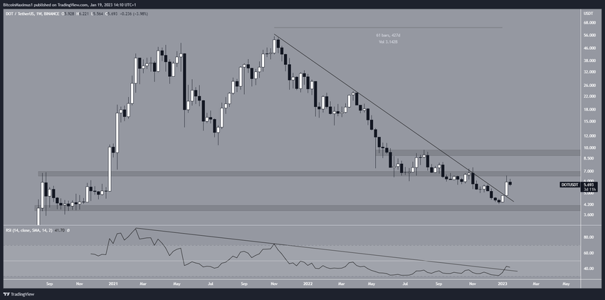 Harga Polkadot terpantau telah ambruk di bawah garis descending resistance sejak mencetak titik tertingginya sepanjang masa (ATH) di level US$55,10 pada November 2021. Alhasil, aksi penurunan harga tersebut menyebabkan tercapainya harga minimum US$4,22 pada bulan Desember 2022 lalu.Sementara itu, garis descending resistance-nya masih tetap utuh selama berlangsungnya serangkaian aksi penurunan ini.