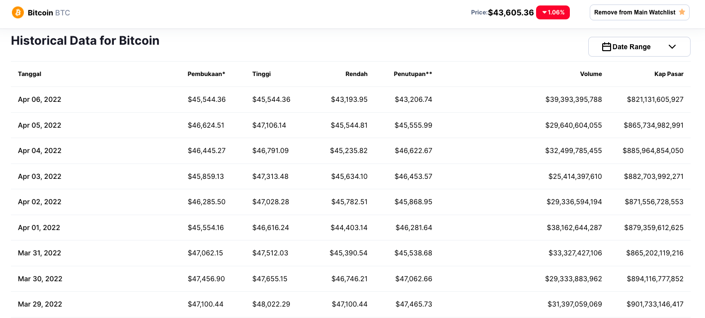 Harga Bitcoin diketahui telah turun hingga 5,1% menjadi US$43.206,74 pada penutupan 6 April 2022. Padahal pada penutupan harga 5 April, posisi Bitcoin berada di level US$45.555,99.