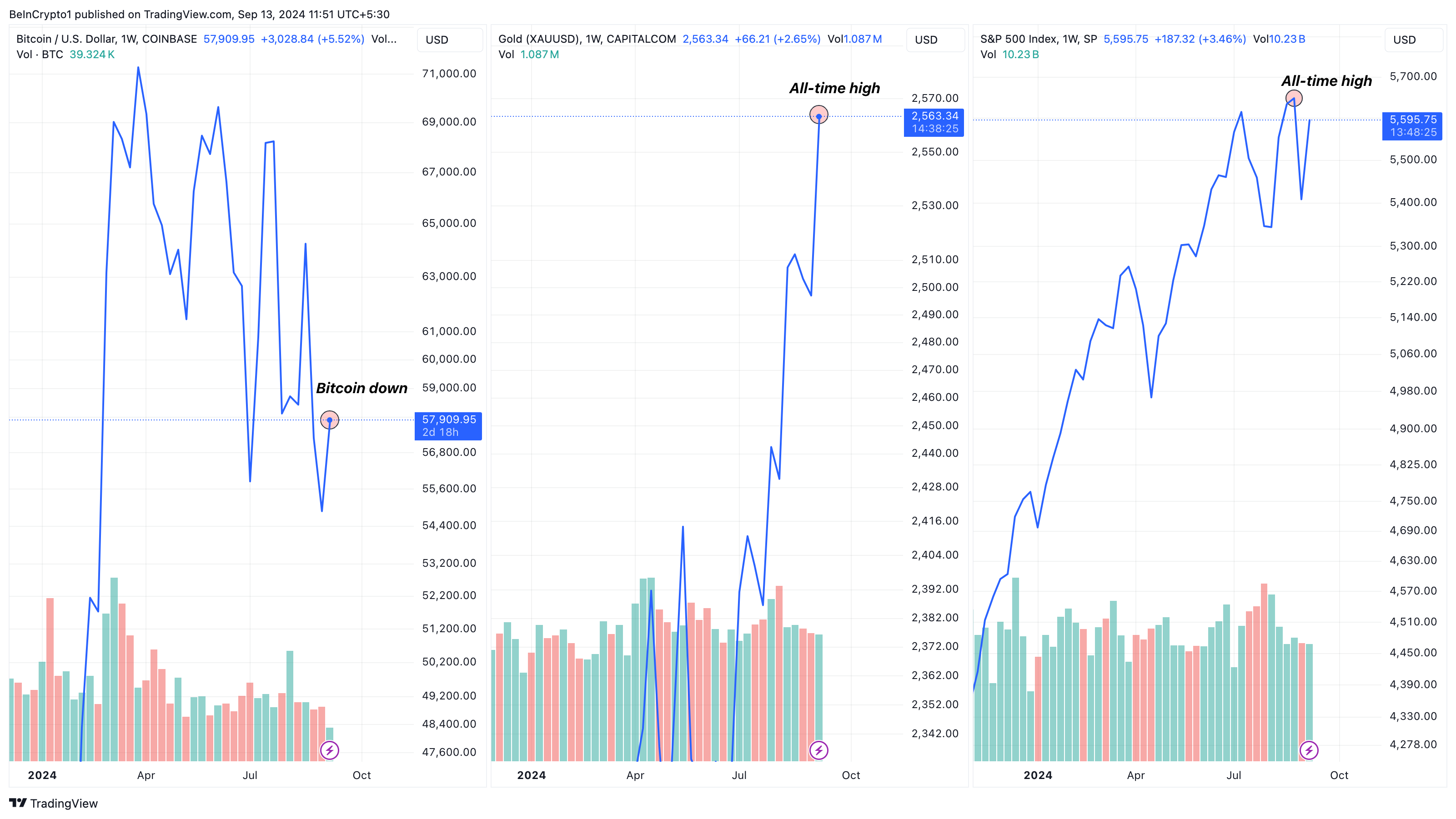 Harga Bitcoin terkini adalah US$58.166, turun 21% dari rekor tertinggi pada Maret. Di sisi lain, emas baru-baru ini mencapai rekor tertinggi baru, dengan nilai US$2.564. S&P 500 yang menjadi acuan saham global juga mencatat rekor baru melampaui US$5.650, dengan Perak juga hampir melakukan harga yang sama.