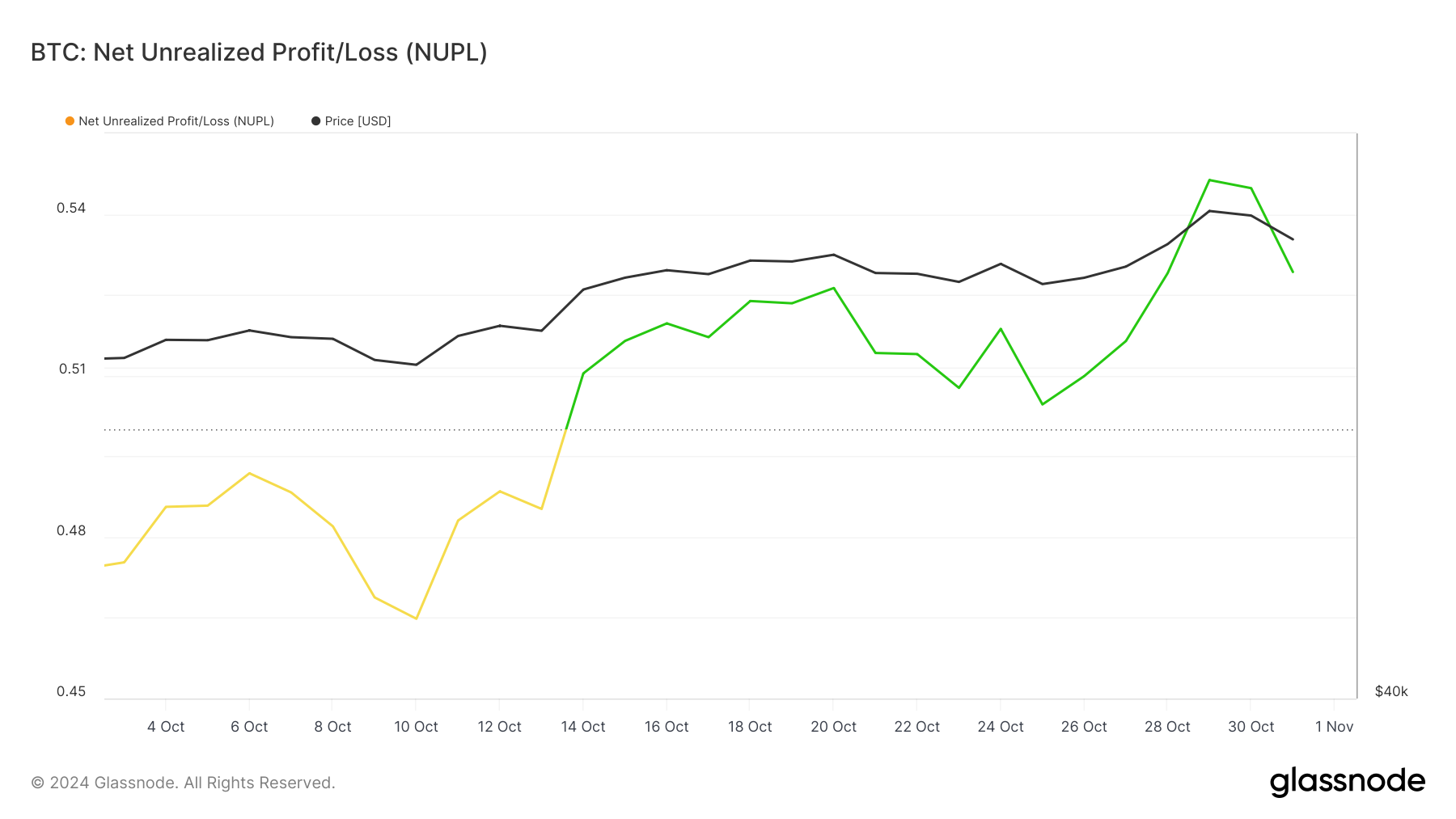 NUPL BTC saat ini berada di 0,529, sedikit lebih rendah dari level 0,546 yang dicapai beberapa hari lalu. Penurunan ini menunjukkan penurunan keuntungan yang belum direalisasi di antara holder, mencerminkan beberapa pengambilan keuntungan baru-baru ini atau jeda dalam optimisme pasar secara keseluruhan.
