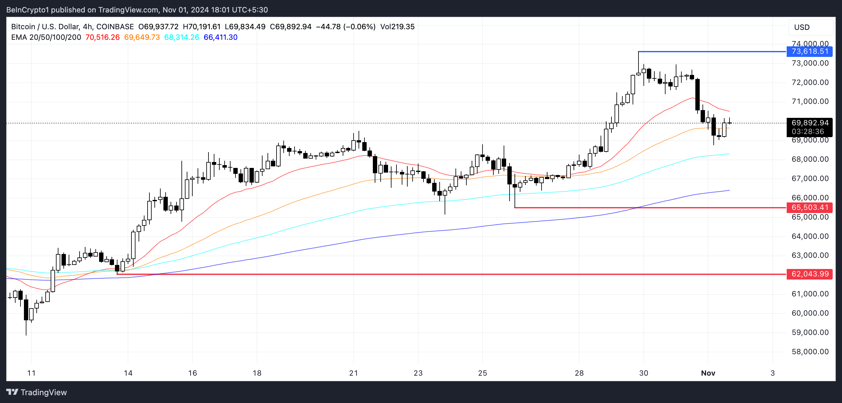 Namun, jarak yang menyempit antara EMA menandakan bahwa momentum bullish telah melambat dalam beberapa hari terakhir. Jika tren naik mendapatkan kekuatan kembali, BTC bisa menargetkan level tertinggi baru di atas US$73,618. Sebaliknya, BTC mungkin terlebih dahulu kembali ke level support di US$65,503; jika level ini gagal, penurunan ke US$62,043, yang menandai koreksi sebesar 11,4%, bisa terjadi.
