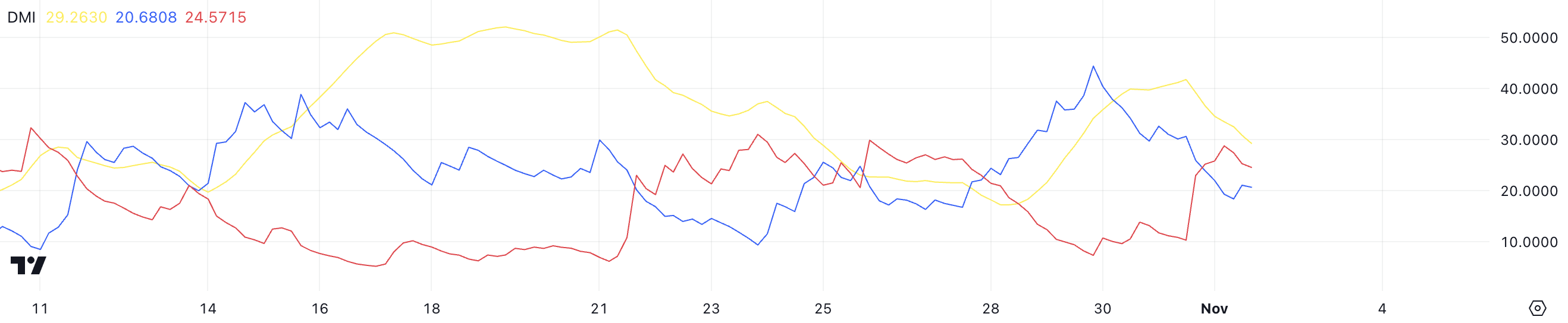 Grafik DMI BTC menunjukkan bahwa ADX-nya saat ini berada di 29,26, turun dari lebih dari 40 beberapa hari lalu. ADX, atau Indeks Arah Rata-rata, mengukur kekuatan tren tanpa menunjukkan arah.
