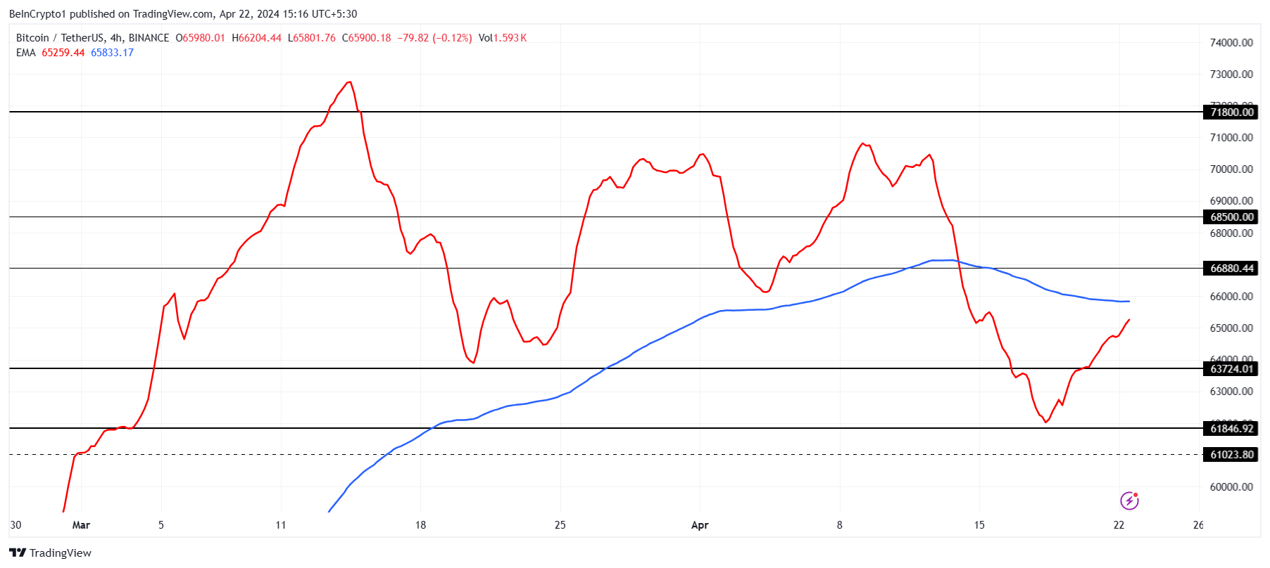 Pada grafik empat jam, EMA 50 hari dan 200 hari nyaris bertemu. Adapun sokongan lebih lanjut dari para investor dapat mendorong EMA 50 hari untuk melintasi EMA 200 hari. Aksi ini sekaligus bakal menandai terbentuknya golden cross. Sebagai informasi, golden cross sendiri dianggap sebagai sinyal akan potensi tren naik.