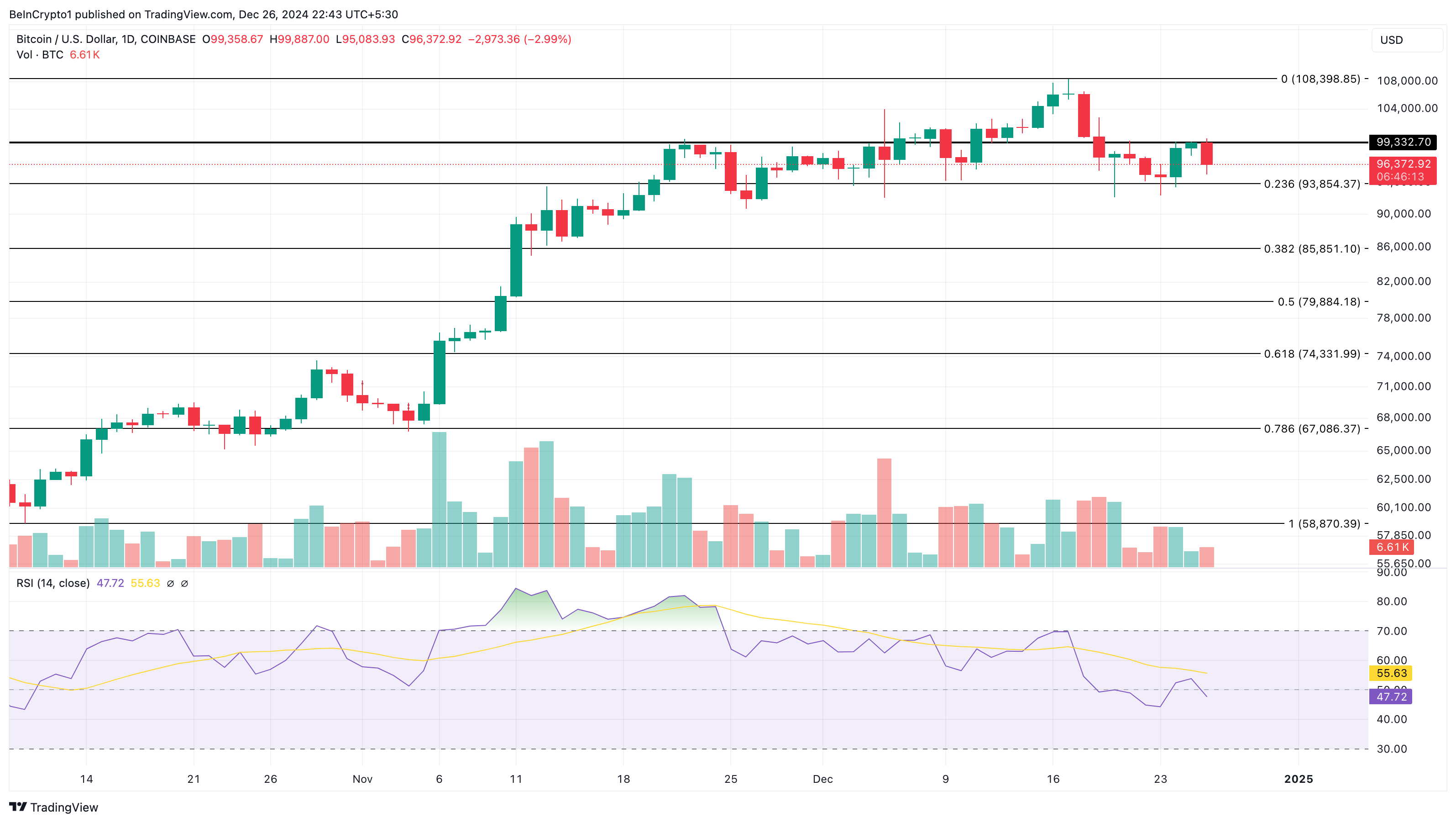 Pada grafik harian, harga Bitcoin menghadapi resistance di US$99.332. Hambatan ini adalah salah satu alasan mengapa aset kripto ini gagal reli menuju US$108.398. Dengan penolakan ini, kemungkinan rebound Bitcoin yang gagal mungkin berlanjut dalam jangka pendek.