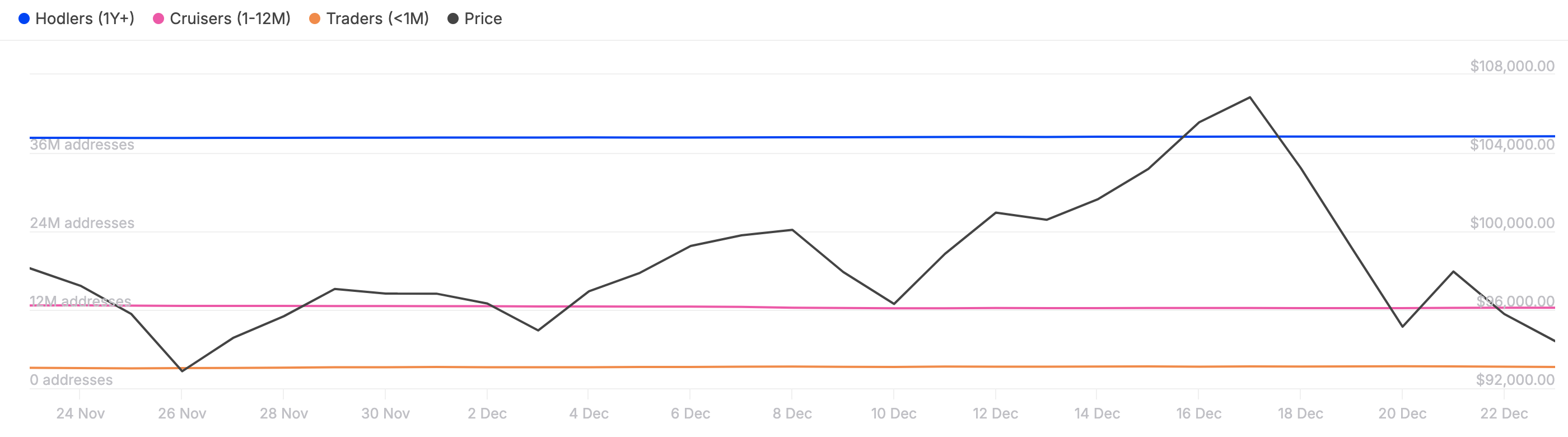 Kelompok ini, yang sering disebut sebagai holder jangka pendek, memainkan peran penting dalam mencerminkan sentimen pasar. Peningkatan dalam kelompok ini biasanya menandakan optimisme yang meningkat, namun penurunan baru-baru ini menunjukkan menurunnya kepercayaan di antara investor ini.