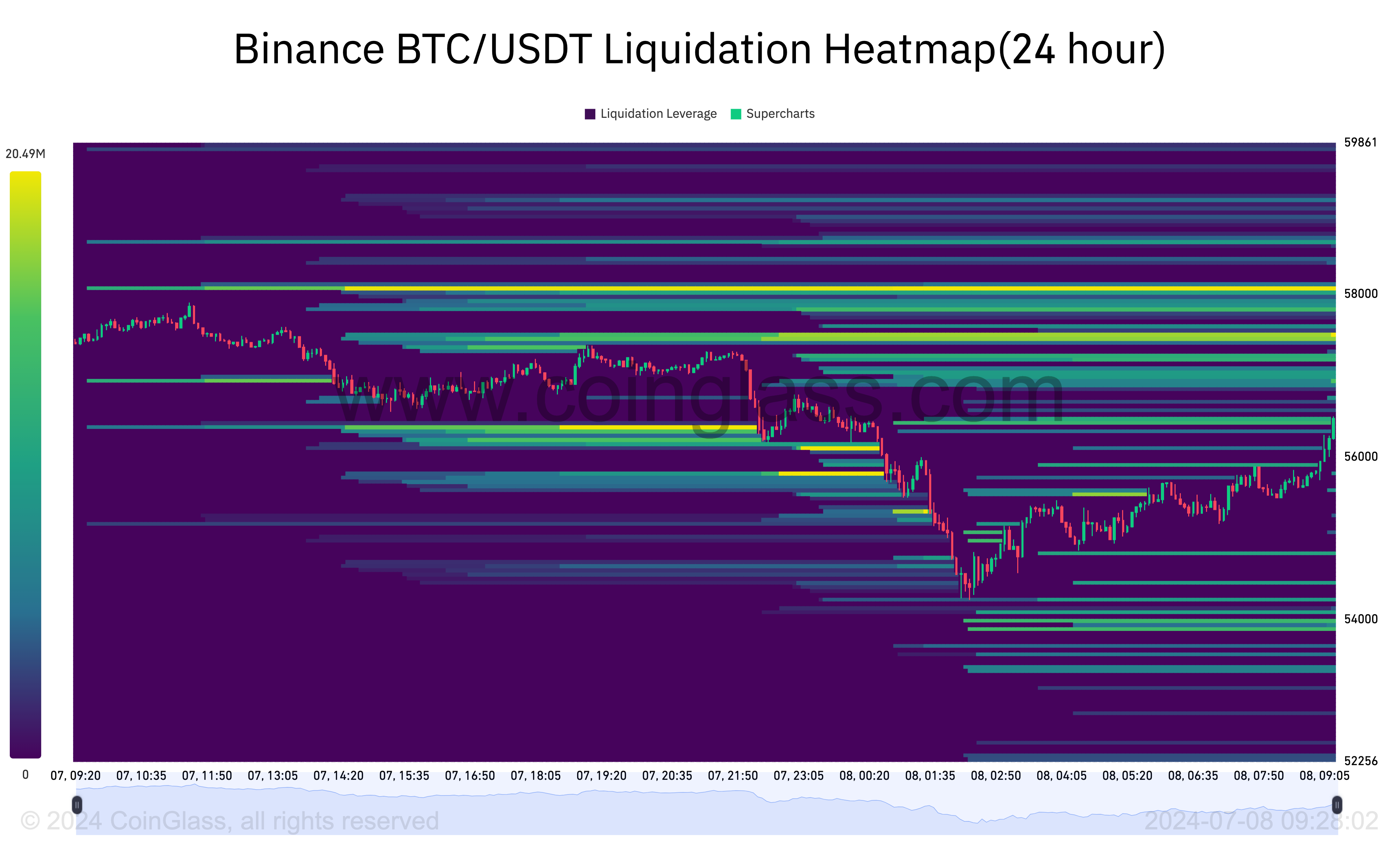 Saat ini, Bitcoin diperdagangkan seharga US$56.752. Namun, Liquidation Heatmap mengatakan harga bisa saja menanjak lebih tinggi lagi dalam jangka pendek.