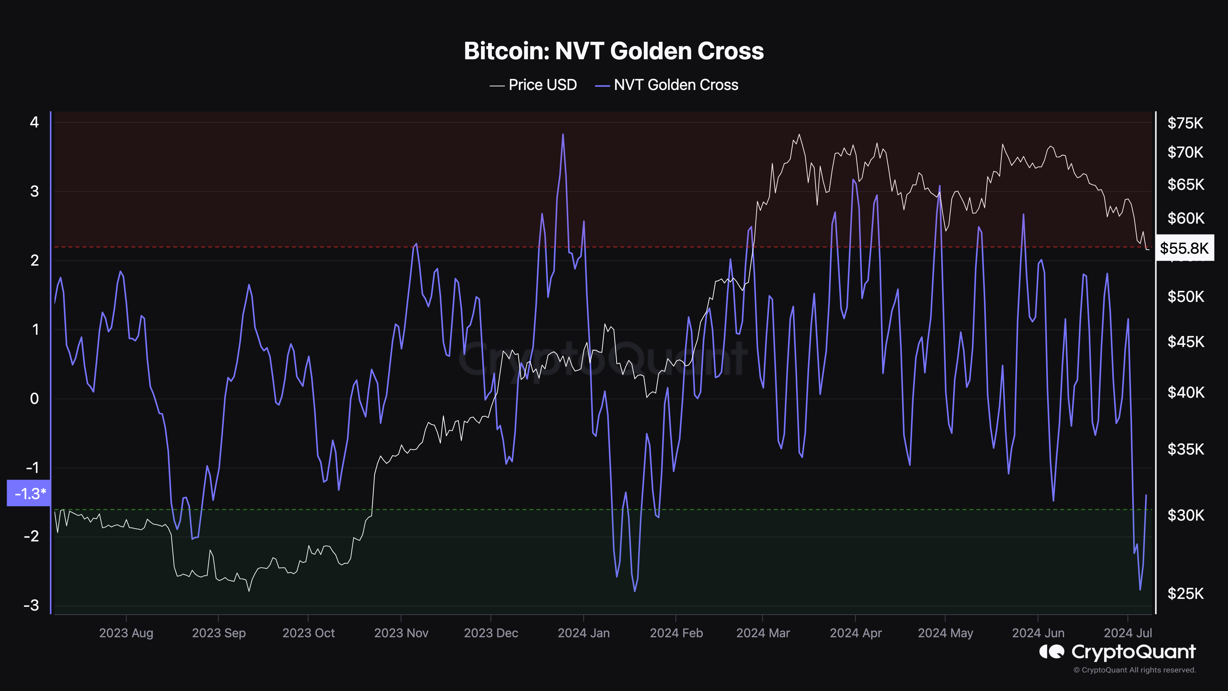 Sebaliknya, jika NVT Golden Cross bertengger di bawah -1,60, artinya BTC nyaris menyentuh ataupun sudah mencapai level bottom.