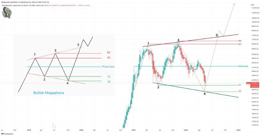 Trader kripto @nihkalowz mengunggah sebuah gambar grafik mingguan Bitcoin di Twitter. Dalam gambar itu, terlihat ia menggunakan candle Heikin-Ashi. Menurutnya, struktur harga BTC sejak awal 2021 mengikuti pola bullish megaphone. Bagian “shoulder“-nya mengembang seiring waktu, mirip seperti pola broadening wedge.