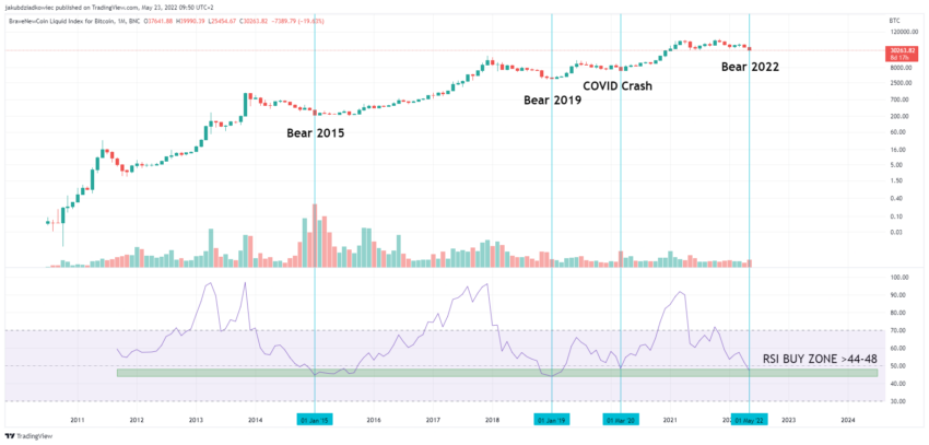 Perlu diketahui bahwa RSI pada grafik bulanan telah mencapai zona beli jangka panjang di kisaran 44-48 (lihat kotak hijau pada gambar). Sejauh ini, dalam sejarah Bitcoin, indikator RSI bulanan telah berada di sana sebanyak 2 kali, yaitu saat Januari 2015 dan Januari 2019. Selain itu, harga BTC sempat memantul dari area ini sekali ketika Maret 2020.