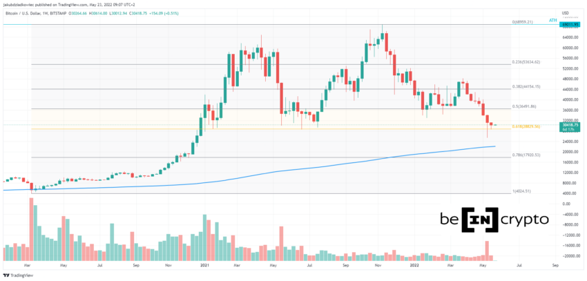 SponsoredBersamaan dengan mencapai support jangka panjang di $28.800, BTC telah mencapai retracement Fib 0,618 yang diukur dari kejatuhan akibat COVID-19 pada Maret 2020. Jika level ini gagal bertahan sebagai support, target berikutnya adalah moving average 200 minggu (200W MA, lihat garis biru pada gambar) di US$22.000 dan retracement Fib 0,786 di US$18.000.