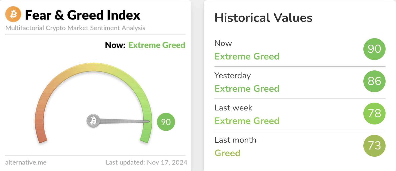 Lebih lanjut, keserakahan ekstrem di pasar juga bisa berdampak pada aksi harga Bitcoin. Saat ini, Crypto Fear and Greed Index, yang utamanya mengukur sentimen Bitcoin, telah mencapai level “Extreme Greed” mencolok di angka 90.