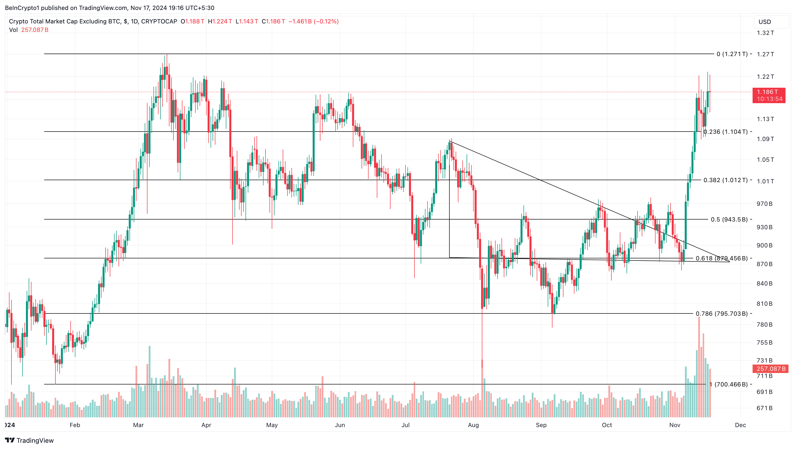 Berdasarkan grafik harian, TOTAL2 mencapai level ini berkat minat besar pada altcoin dan juga breakout dari pola descending triangle. Descending triangle biasanya dianggap sebagai pola bearish. Namun, pola ini juga dapat menandakan bullish reversal apabila harga berhasil breakout ke arah sebaliknya, seperti yang terjadi pada kapitalisasi pasar altcoin.