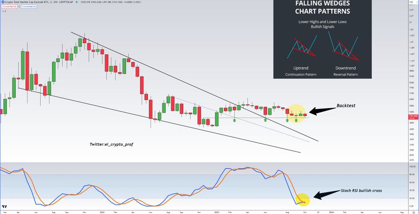 Di sisi lain, seorang analis kripto yang dikenal dengan nama “Moustache” telah mengamati sebuah breakout dari pola falling wedge yang berusia dua setengah tahun untuk total kapitalisasi pasar, dengan mengecualikan Bitcoin.