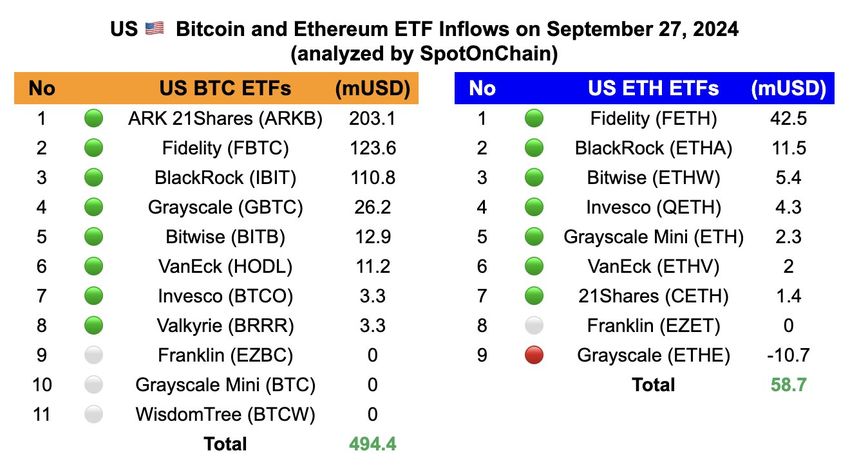 Investor aset kripto membeli 7.526 Bitcoin (BTC) dan 22.310 Ethereum (ETH) pada hari Jumat, menghasilkan arus masuk bersih sebesar US$494,4 juta dan US$58,7 juta untuk ETF Bitcoin dan Ethereum, masing-masing.