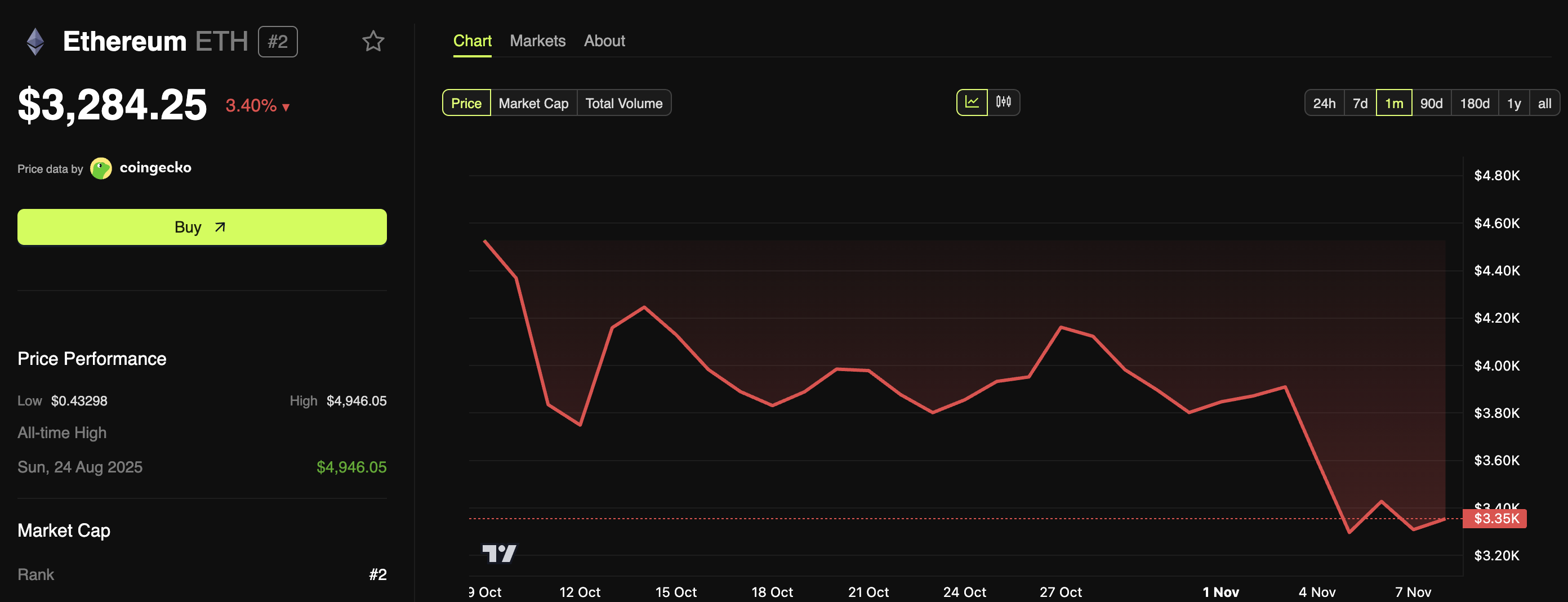 Sementara itu, Ethereum juga mengalami penurunan. Selama seminggu terakhir, nilai ETH turun sekitar 15%. Pada saat penulisan, harga perdagangan altcoin ini mencapai US$3.284, turun 3,40% selama hari terakhir.