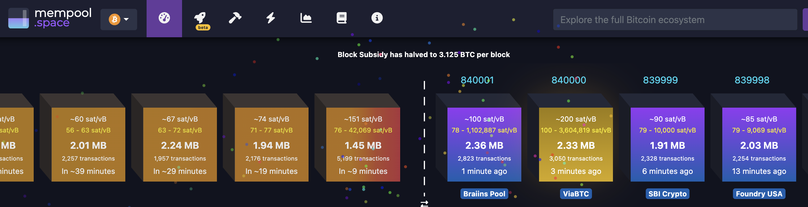 ViaBTC menjadi mining pool yang berhasil menambahkan blok baru ke blockchain Bitcoin pada ketinggian blok 840.000. Para miner yang tergabung dalam mining pool ini secara keseluruhan berhasil mengantongi reward dan total biaya yang mencapai 40,751 BTC atau sekitar US$2,6 juta (Rp42,19 miliar).