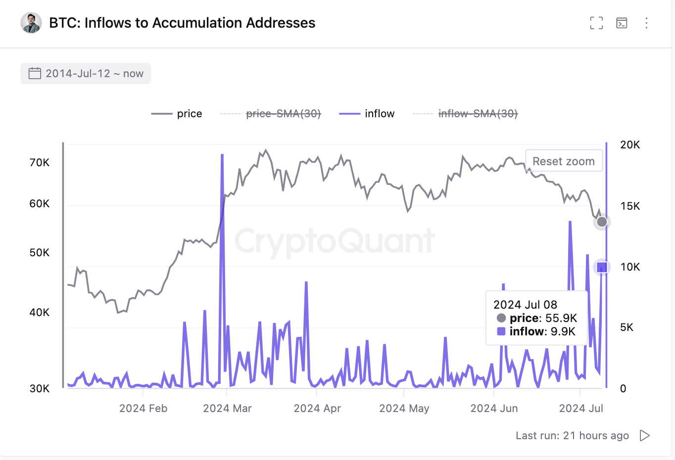 Menariknya, lonjakan akumulasi untuk Bitcoin berhasil melampaui produk ETF. Menurut CryptoQuant, alamat akumulasi Bitcoin menerima sekitar 7.700 BTC (sekitar US$436,5 juta) pada hari Selasa (9/7). Aktivitas substansial ini menunjukkan kepercayaan luas pada potensi Bitcoin untuk kenaikan harga yang berkelanjutan.