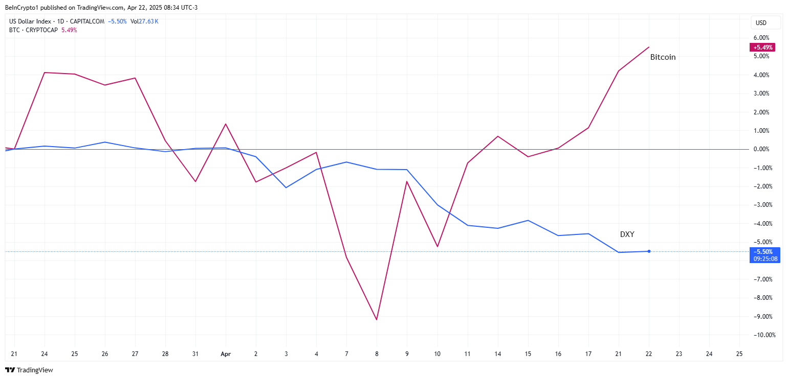 Secara historis, performa Bitcoin menunjukkan korelasi terbalik dengan DXY. Ini memicu spekulasi bahwa momen krusial bagi kripto pelopor itu bisa segera tiba.