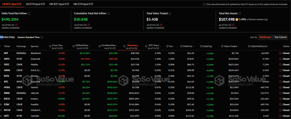 Namun, adopsi yang meningkat dari ETF Bitcoin (exchange-traded funds), yang menarik minat institusional yang signifikan, mendorong kenaikan Bitcoin. Menurut data di SoSoValue, total arus bersih kumulatif untuk ETF Bitcoin mencapai US$30,84 miliar pada 22 November, ketika pasar ditutup pada hari Jumat.