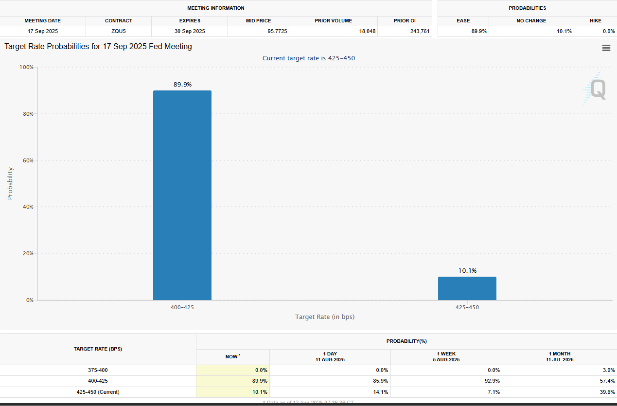 Seiring pasar kripto mencerna cetakan CPI, semua mata tertuju pada Federal Reserve (Fed). Para petaruh suku bunga melihat peluang 90% bahwa para pembuat kebijakan akan memangkas suku bunga sebesar seperempat basis poin (bp) pada bulan September.