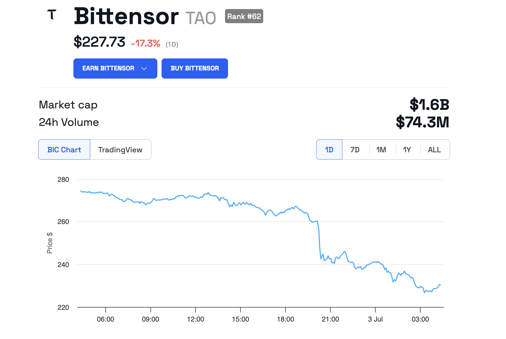 SponsoredHarga token TAO sudah tergelincir lebih dari 17%. Saat ini, harganya berkisar di angka US$227,73.