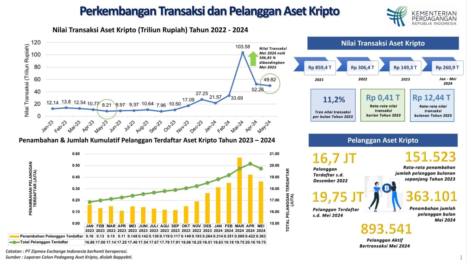 Data dari Badan Pengawas Perdagangan Berjangka Komoditi (Bappebti) mencatat, pada bulan Mei 2024, nilai transaksi aset kripto membukukan US$49,82 triliun. Jumlah ini naik 506,83% dari periode yang sama tahun lalu.
