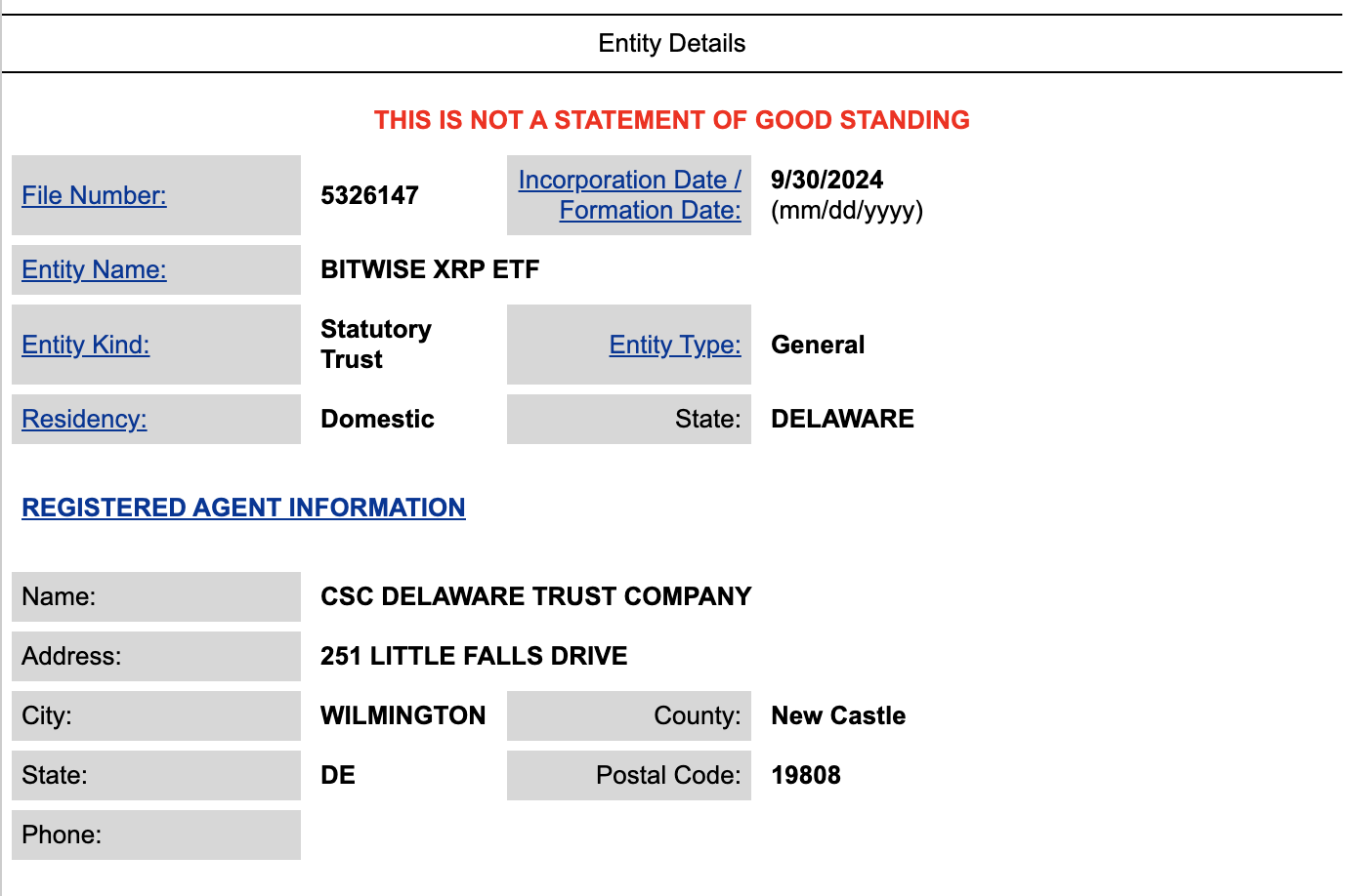 Bitwise Asset Management resmi mengajukan aplikasi untuk entitas bernama Bitwise XRP ETF di negara bagian Delaware. Berdasarkan pengajuan yang tercantum di situs web Delaware Department of State, Bitwise mengajukan ETF ini pada tanggal 30 September. Agen terdaftar untuk pengajuan ini adalah CSC Delaware Trust Company, yang menyediakan layanan kepatuhan untuk kebutuhan hukum dan korporasi.