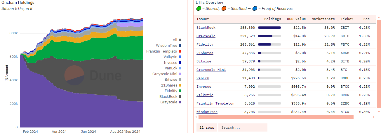 Memang, arus masuk ETF Bitcoin telah masif sejak instrumen keuangan tersebut memasuki pasar pada 11 Januari. Data Dune menunjukkan bahwa IBIT BlackRock mendominasi sektor tersebut, dengan memegang lebih dari 38% pangsa pasar dan mengelola US$22,5 miliar dalam aset di rantai.