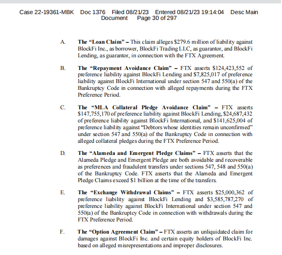 Sementara itu, dalam tuntutan FTX, BlockFi dituntut 6 tanggung jawab. Keenam tanggung jawab itu di antaranya adalah US$279,6 juta yang berhubungan dengan perjanjian FTX; US$124,42 juta sebagai klaim penghindaran pembayaran; US$314,05 juta sebagai klaim penghindaran perjanjian agunan MLA; lebih dari US$1 miliar klaim Alameda dan perjanjian Emergent; serta US$28,58 juta sebagai klaim penarikan dana.