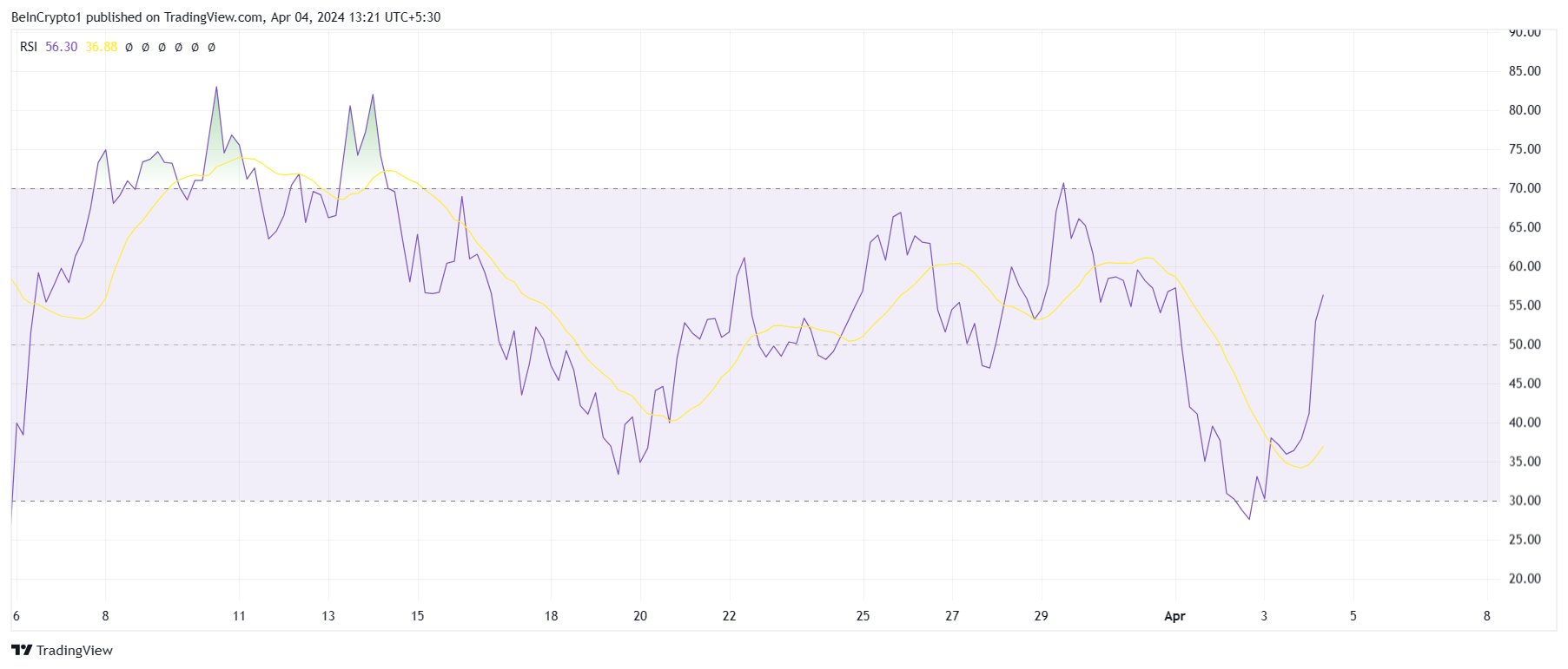 Di sisi lain, Relative Strength Index (RSI) BNB terpantau kembali memasuki zona bullish. RSI sendiri adalah osilator momentum yang mengukur kecepatan dan besarnya pergerakan harga. Sehingga, indikator ini dapat membantu trader dalam mengidentifikasi kondisi overbought (jenuh beli) atau oversold (jenuh jual) di pasar.