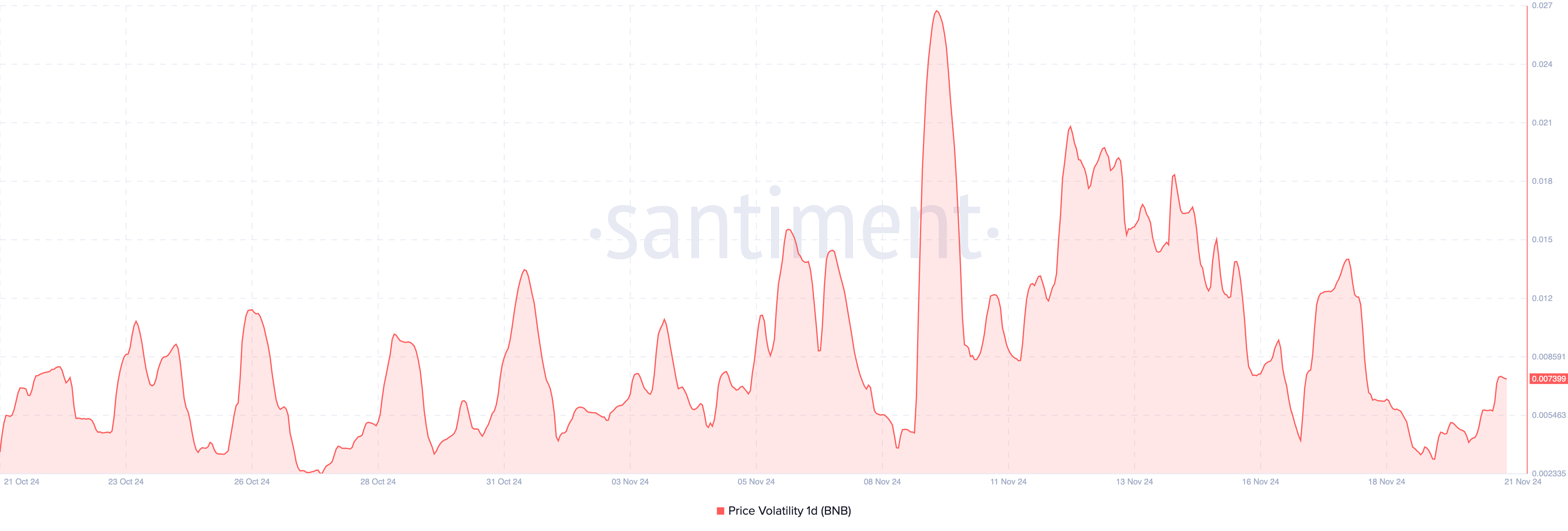 Menurut Santiment, volatilitas satu hari BNB telah menurun dari puncak terbarunya, menunjukkan fluktuasi harga yang berkurang. Penurunan volatilitas ini bisa membuat BNB sulit mencapai breakout yang signifikan di atas US$600, karena pasar mungkin kekurangan momentum yang dibutuhkan untuk pergerakan besar.