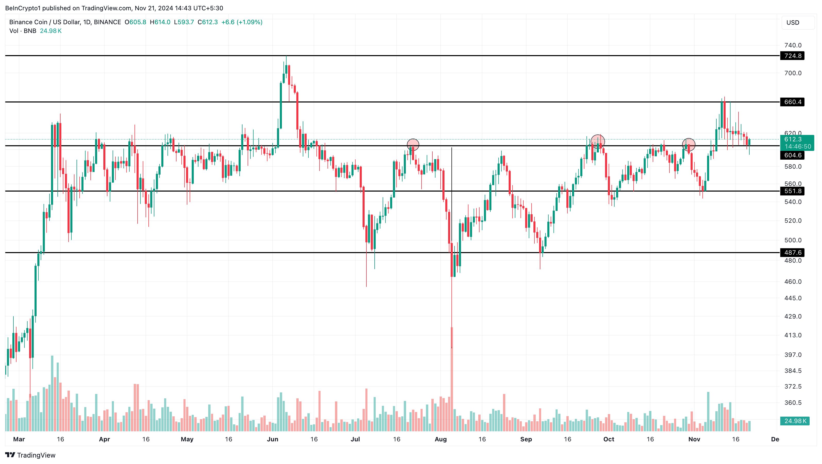 Sementara BNB diperdagangkan sekitar US$612, volatilitas di sekitarnya nampaknya menjadi alasan mengapa tetap di atas US$600 namun belum membuat kenaikan harga yang substansial.