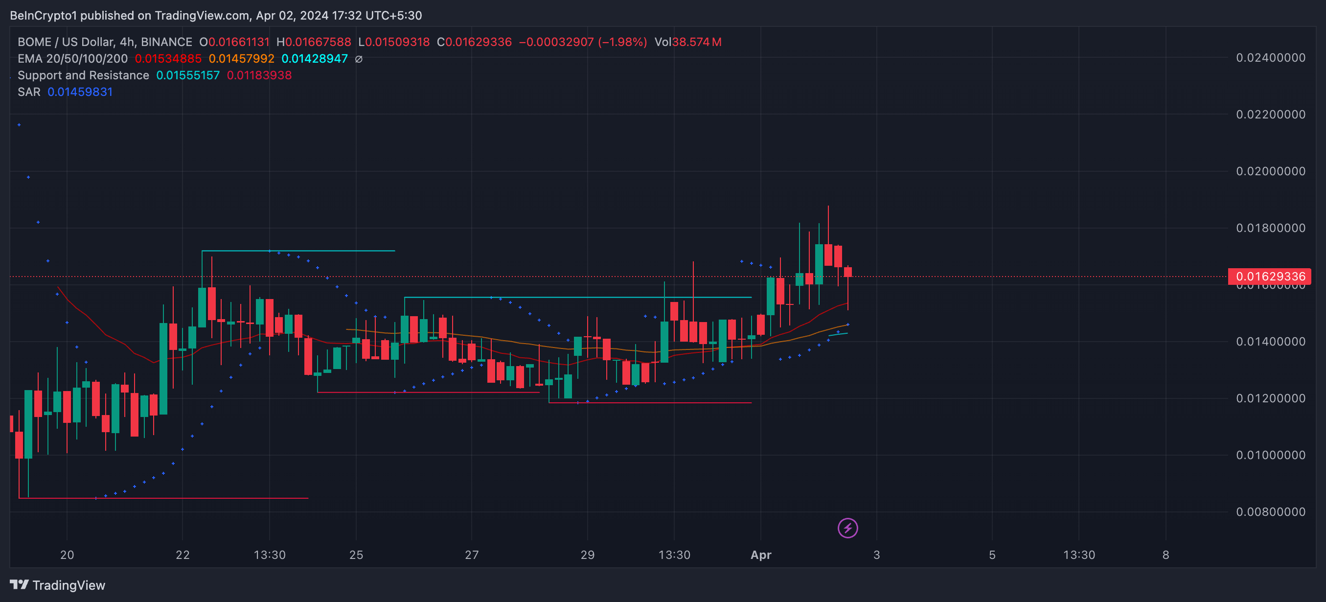 Harga BOME memancarkan peluang untuk fase bull run yang baru. Hal ini sebagaimana terlihat pada golden cross di grafik harga 4 jam (4H) yang terbentuk pada tanggal 31 Maret. Golden cross sendiri terjadi ketika moving average jangka pendek melintas di atas moving average jangka panjang.