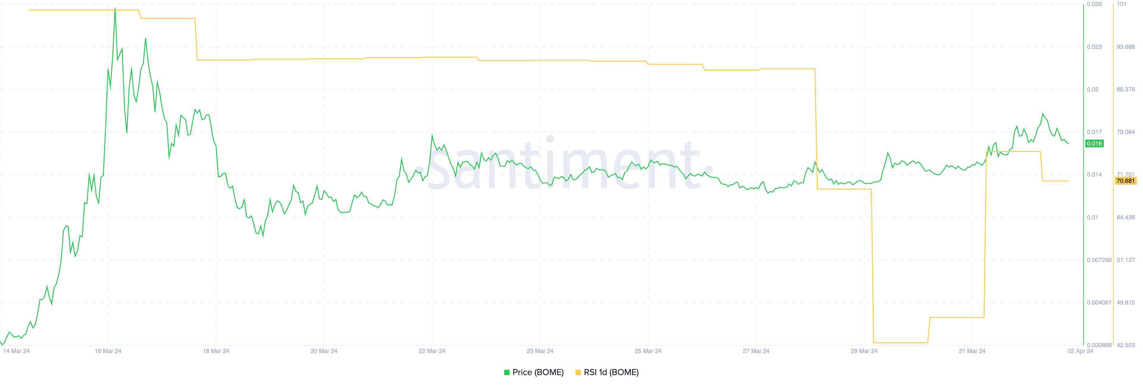 Relative Strength Index (RSI) harian (1D) BOME saat ini berada di 70,6, menandai penurunan tipis dari 75,5 yang tercatat pada hari Senin (1/4). Hal yang perlu dicatat, RSI aset ini berkutat di kisaran 89 hingga 91 selama paruh kedua bulan Maret, periode ketika harga BOME bergerak sideways.