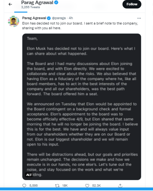Agrawal menjelaskan, saat akan digelar rapat untuk menerima Elon Musk sebagai bagian dari manajemen perusahaan, Musk pada hari yang sama memutuskan untuk tidak bergabung bersama jajaran manajemen Twitter.
