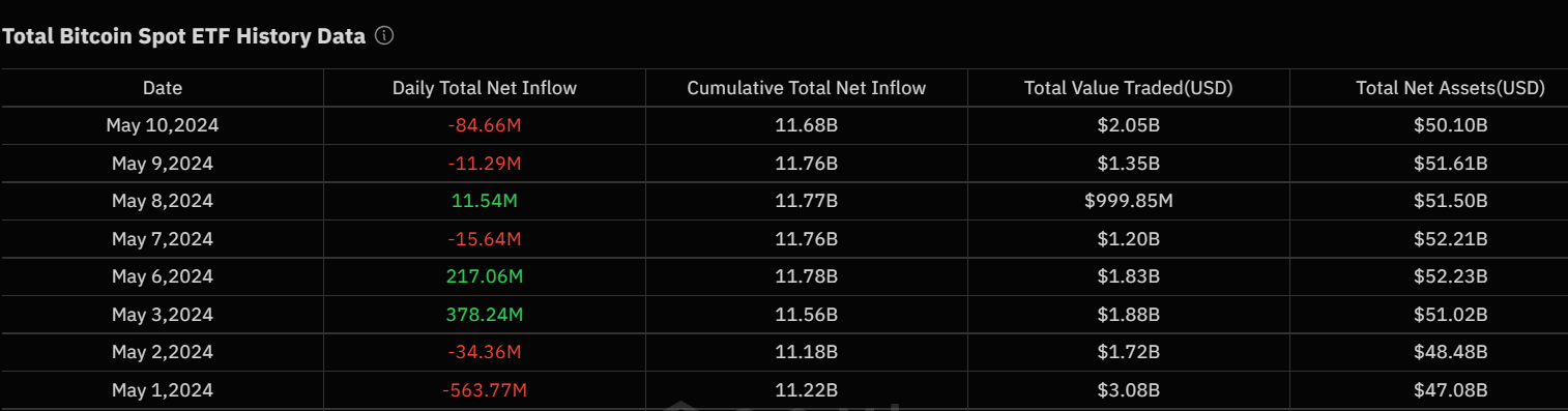 Pada 3 Mei, total arus masuk bersih harian adalah US$378,24 juta. Sementara itu, pada 6 Mei dan 8 Mei, arus masuknya masing-masing sebesar US$217,06 juta dan US$11,54 juta. Sedangkan untuk sisa bulan Mei, ETF mencatat arus keluar dengan arus keluar terbesar senilai US$563,77 juta pada 1 Mei.