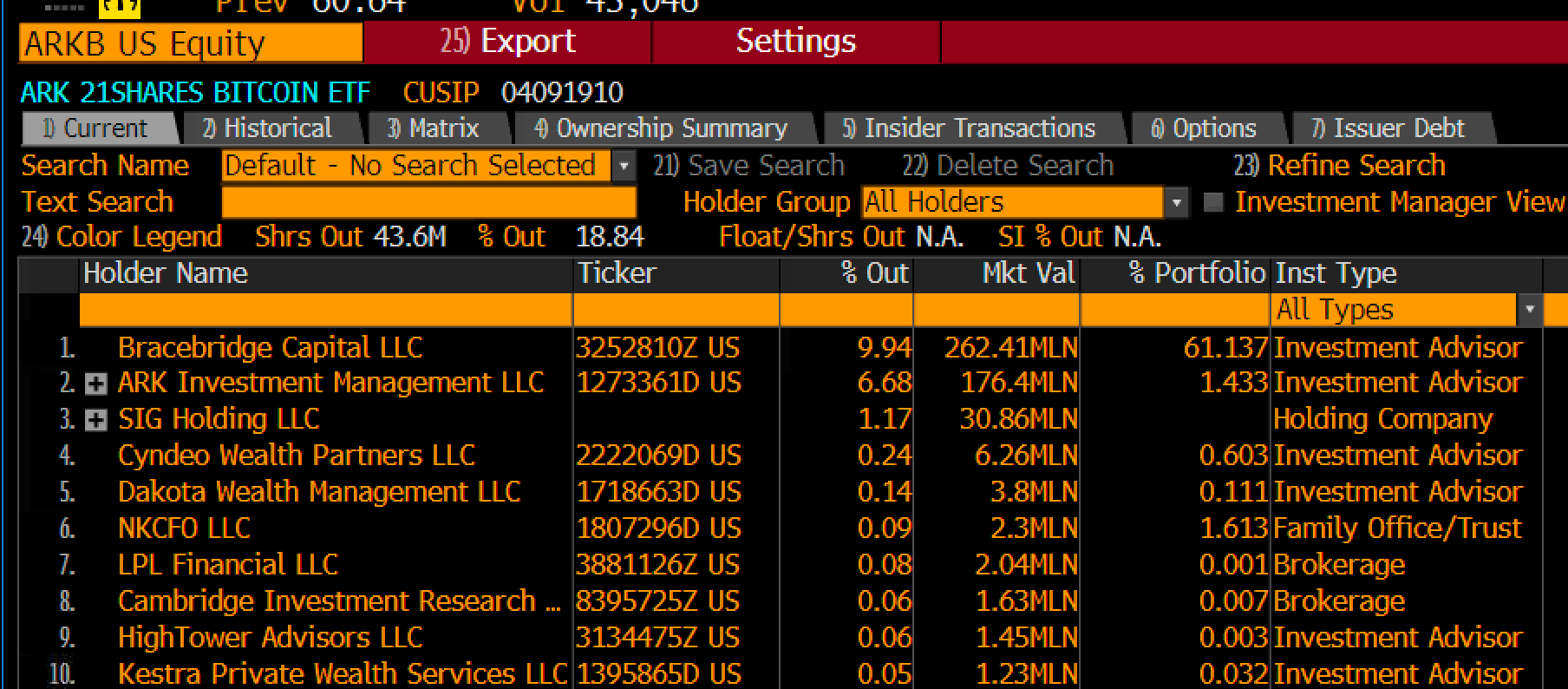 Data Bloomberg Intelligence mengungkapkan, Bracebridge Capital memegang US$262 juta di ARKB, US$81 juta di IBIT, dan US$20 juta di GBTC. Lebih lanjut, data menunjukkan bahwa Bracebridge Capital adalah holder terbesar ARKB.