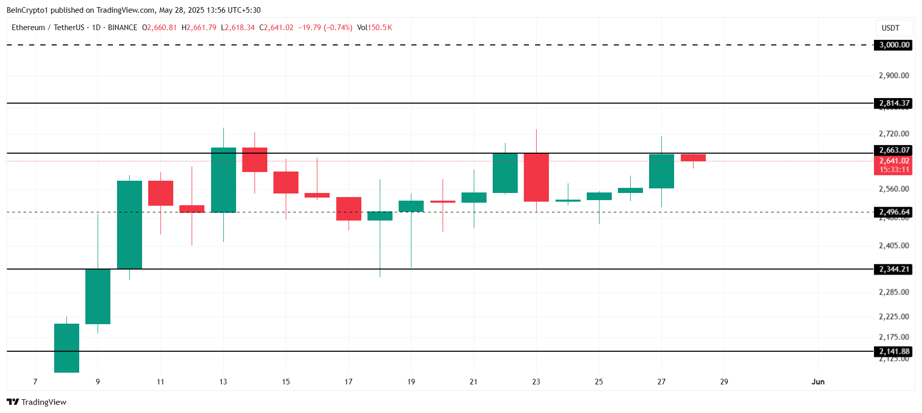 Ethereum saat ini nangkring di US$2.641 dan masih kesulitan menembus resistance US$2.663. Ini menjadi percobaan gagal ketiga sejak awal bulan, yang utamanya terpicu oleh tekanan jual dan zona pasokan besar seperti yang dijelaskan di atas.