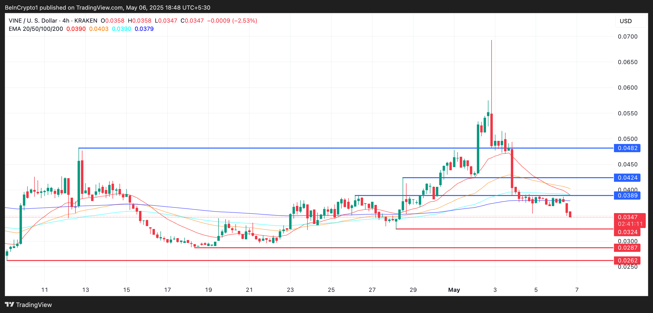 Namun, jika pembeli masuk dan membalikkan tren turun saat ini, VINE mungkin menguji resistance di US$0,0389. Breakout kuat di atas level itu bisa membuka jalan ke US$0,0424 dan berpotensi US$0,0482.