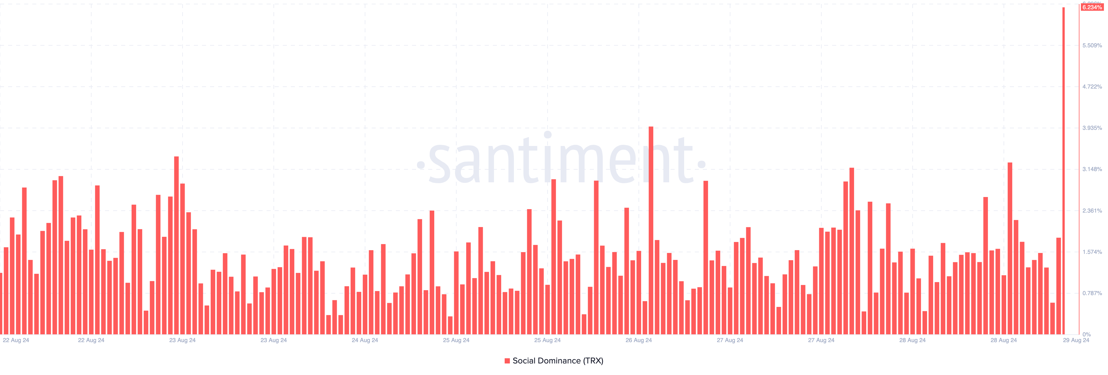 Kenaikan harga ini utamanya terdorong oleh peluncuran generator meme coin SunPump pada bulan Agustus. Generator ini sukses memacu permintaan untuk TRX. Di sisi lain, dominasi sosial altcoin ini sedang menanjak dan kini berada di angka 6,23%. Kondisi ini mencerminkan perhatian yang semakin besar pada proyek ini.