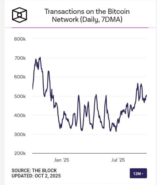 Jika kita melihat data dari The Block, aktivitas on-chain Bitcoin menunjukkan tren yang semakin solid. Grafik transaksi harian (7DMA) sepanjang 12 bulan terakhir menampilkan pola fluktuasi antara 300 ribu hingga 700 ribu transaksi per hari.
