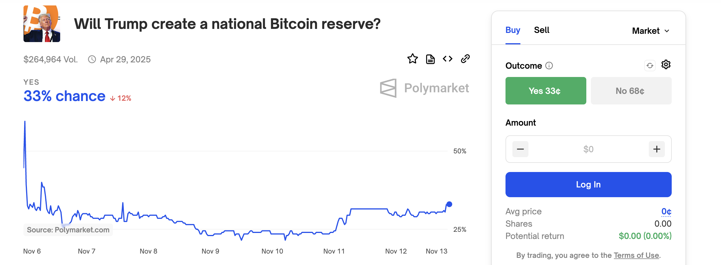 Peluang Polymarket, dari sisi mereka, setuju dengan prediksi bearish Novogratz. Pasar prediksi terdesentralisasi ini baru-baru ini mendapatkan kredibilitas setelah sukses memprediksi kemenangan Trump, dan mengklaim cadangan Bitcoin AS hanya memiliki peluang 33% untuk terjadi. Memang, taruhan aktif satu-satunya adalah apakah Trump akan memenuhi janjinya dalam 100 hari pertama, bukan selama masa jabatannya.
