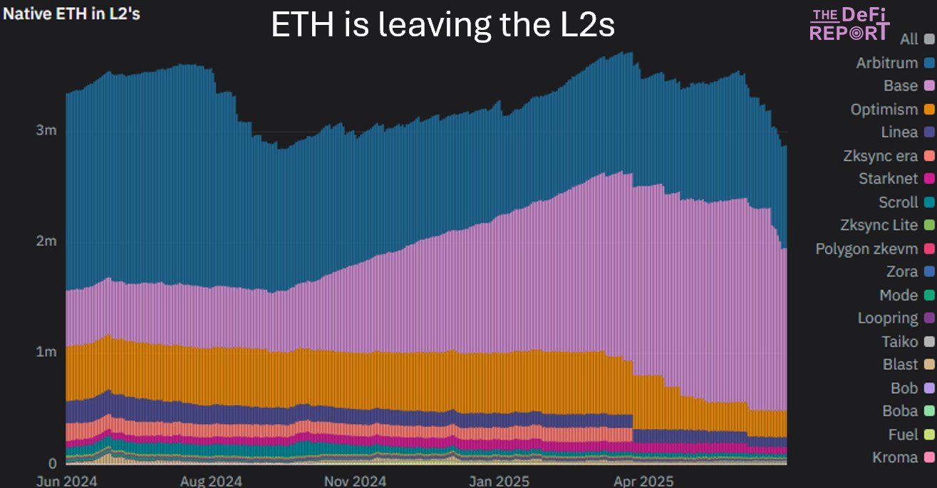 Grafik dari The DeFi Report menggambarkan tren ini secara jelas. Sejak awal 2025, jaringan L2 besar seperti Optimism dan Base mencatatkan penarikan ETH dalam jumlah fantastis. Menurut analisis, depresiasi harga token L2 Ethereum jadi pemicu utama.