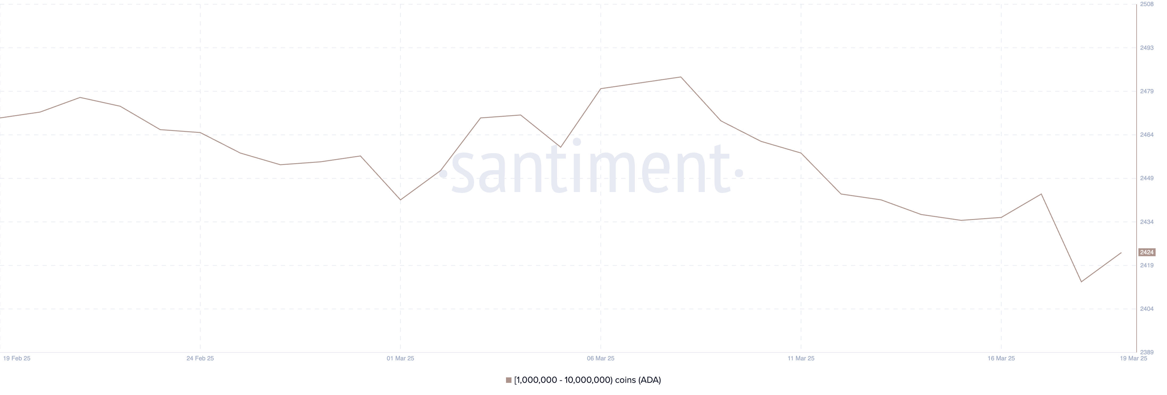 Menurut data Santiment, jumlah whale ADA turun dari 2.484 menjadi hanya 2.414, menandai level terendah sejak Juli 2024.
