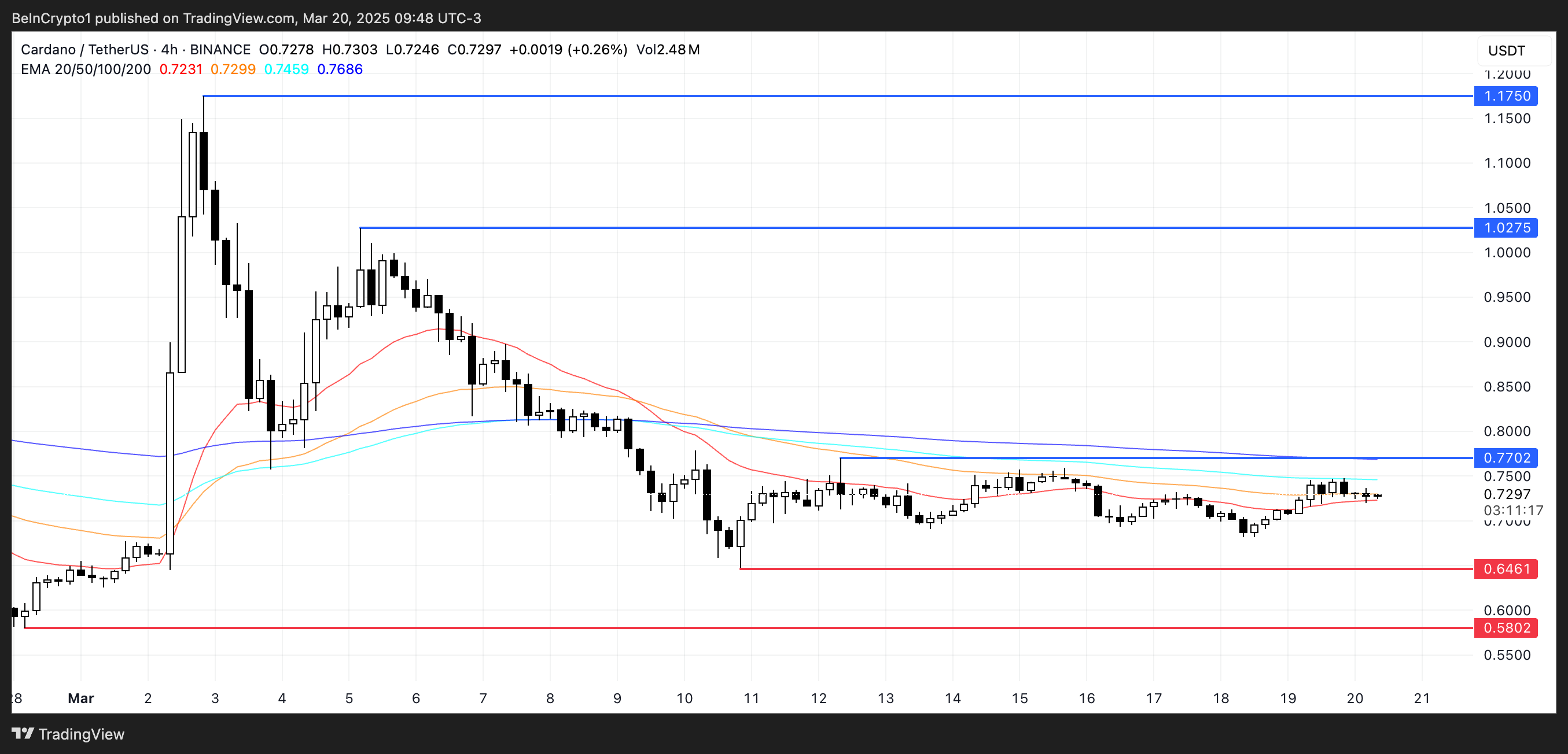 Pengaturan ini menunjukkan ketidakpastian di pasar, namun juga memberikan ruang untuk potensi breakout. Jika harga Cardano berhasil membangun momentum bullish dan membentuk tren naik, target pertama bisa mencapai resistance US$0,77.