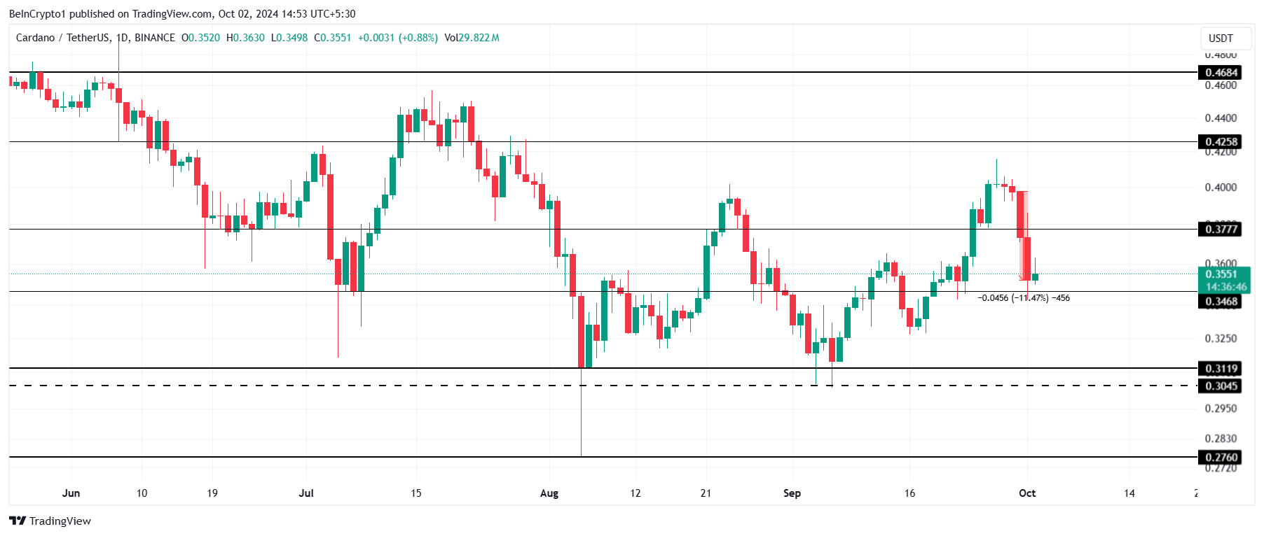 Saat penulisan, Cardano diperdagangkan di level US$0,35. Sedikit di atas level support kunci US$0,34. Jika ADA berhasil mempertahankan support ini, terdapat peluang besar untuk token tersebut memantul menuju level resistance US$0,37. Pemulihan di sini dapat membuka pintu bagi momentum kenaikan lebih lanjut, yang memungkinkan Cardano membalikkan kerugiannya baru-baru ini.